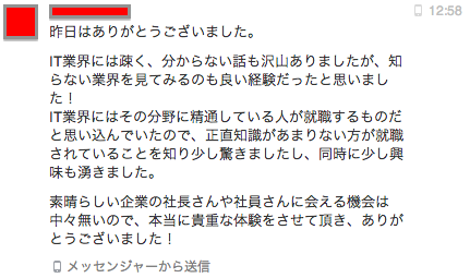 これは先ほど、もらった参加した学生からいただいたメッセージ。